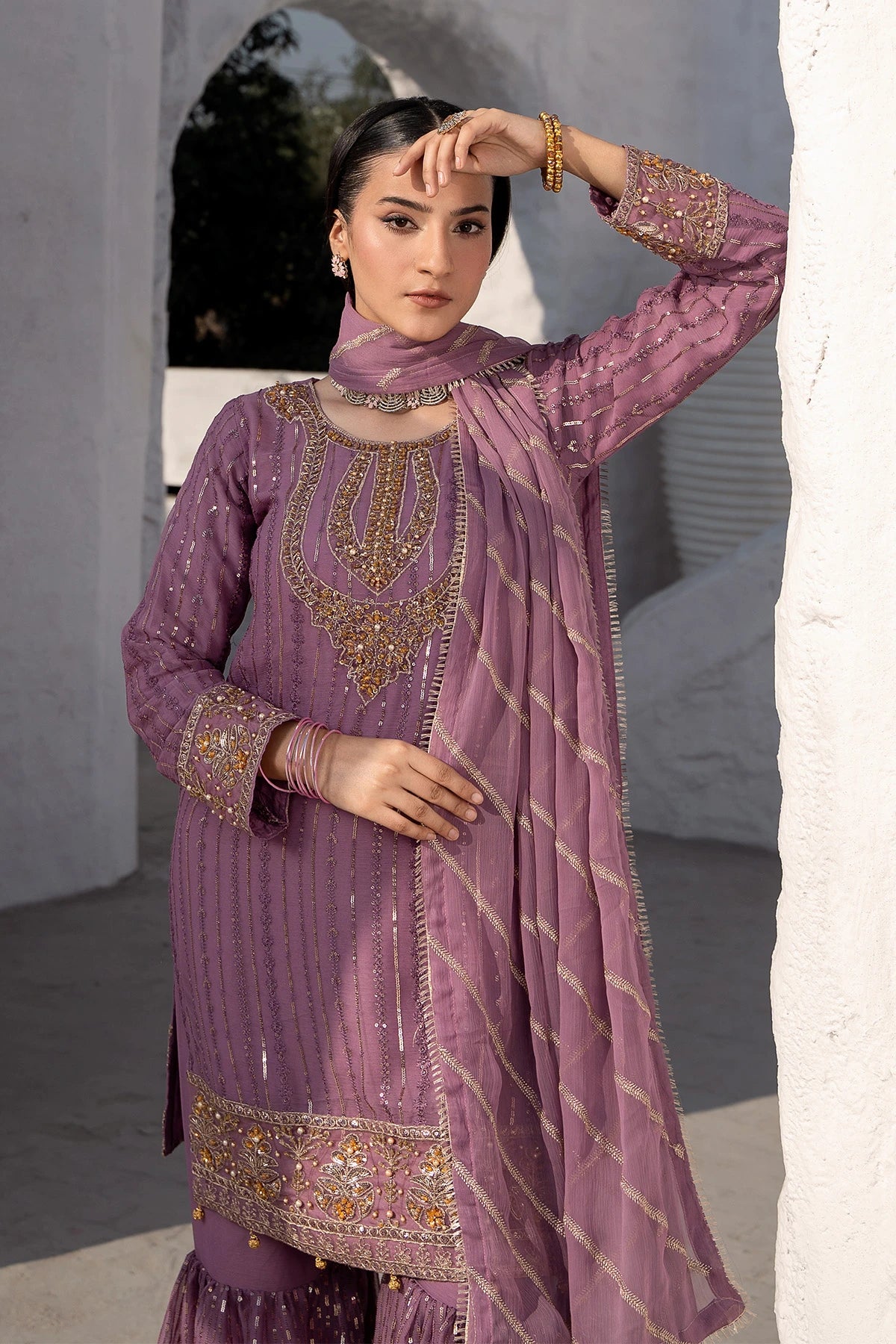 Includes: Kameez, sharara pants, embroidered dupatta